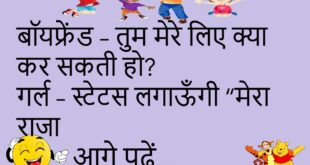 बच्चा – टीचर, मैं होमवर्क भूल गया टीचर – क्यों? बच्चा – मोबाइल का बैटरी खत्म थी 😅 ******************************************* गर्ल – मैं तुम्हारे लिए कुछ भी कर सकती हूँ बॉय – तो मेरे एग्जाम दे दो 😆 ******************************************* संता – डॉक्टर, मेरा दिल भारी है डॉक्टर – लोन लिया क्या? 😂 ******************************************* बॉयफ्रेंड – तुम मेरे लिए क्या कर सकती …
