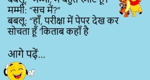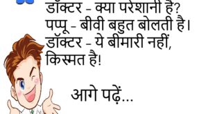 बच्चा: “पापा, आज स्कूल में टीचर ने कहा कि सबको एक कहानी सुनानी है।” पापा: “तो क्या कहानी सुनाई?” बच्चा: “टीचर की कहानी।”😊😊😊😊😊 ****************************************** पप्पू: “मैं डॉक्टर बनना चाहता हूँ।” दोस्त: “क्यों?” पप्पू: “क्योंकि मम्मी कहती हैं, काम कर लो।”😊😊😊😊😊 ****************************************** पति (बीवी से): “तुम बहुत मीठी हो।” बीवी: “शुगर का टेस्ट करवाया क्या?”😊😊😊😊😊 ****************************************** टीचर: “इतने दिन कहाँ थे?” …