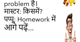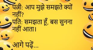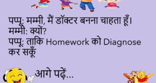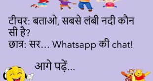 टीचर: बताओ, सबसे लंबी नदी कौन सी है?छात्र: सर… Whatsapp की chat!😊😊😊😊😊 ********************************************** पप्पू: मम्मी, मेरी जूते खो गए।मम्मी: तो क्या हुआ?पप्पू: अब मैं barefoot ही स्कूल जाऊँगा, fashion statement है!😊😊😊😊😊 ********************************************** पति: तुम्हारी स्माइल बहुत प्यारी है।पत्नी: सच में?पति: हाँ… जब तुम नाराज़ होती हो।😊😊😊😊😊 ********************************************** बच्चा: मम्मी, मुझे नया बैग चाहिए।मम्मी: क्यों?बच्चा: पुराने बैग में Homework दिखे ही …