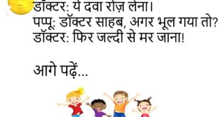 मास्टर: बताओ सूरज सबसे पहले कहाँ निकलता है?छात्र: सर… मम्मी के गुस्से में!😊😊😊😊😊 ********************************************** पप्पू डॉक्टर के पास गया।डॉक्टर: तुम्हें नींद नहीं आती?पप्पू: आती है, लेकिन जब तक टीवी बंद नहीं कर देता, नींद आती ही नहीं।😊😊😊😊😊 ********************************************** पत्नी: अगर मैं खो जाऊँ तो तुम क्या करोगे?पति: मैं अखबार में इश्तिहार दूँगा।पत्नी: क्या लिखोगे?पति: “जो मेरी पत्नी मिले, वो मुझे …