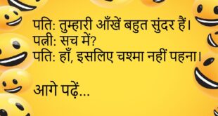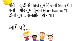लड़की – आप मुझे पिकनिक पर क्यों नहीं ले जाते? लड़का – बिजली नहीं थी तो Mobile ही चार्ज नहीं कर पाया, Picnic कहाँ से चार्ज करूंगा!😊😊😊😊😊 ****************************************** पति – शादी से पहले तुम कितनी Slim थी। पत्नी – और तुम कितने Handsome थे। दोनों चुप… समझौता हो गया।😊😊😊😊😊 ****************************************** डॉक्टर – दिन में 8 घंटे सोना चाहिए। पप्पू – …