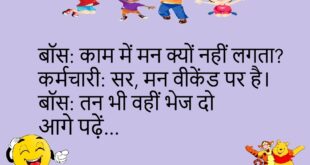बॉस: काम में मन लगाओ। कर्मचारी: सर, मन वीकेंड पर है। बॉस: वापस बुलाओ 📆😂 *********************************** पत्नी: शॉपिंग चलें? पति: अभी नहीं। पत्नी: ये शब्द याद रखना 🛍️😆 *********************************** डॉक्टर: नींद पूरी लेते हो? मरीज: कोशिश करता हूँ। डॉक्टर: नींद आपको ब्लॉक कर चुकी है 😴😂 *********************************** दोस्त: आज इतना थका क्यों? मैं: सपनों में काम किया। दोस्त: ओवरटाइम भी …