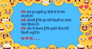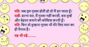 पत्नी: सुनिए जी, आप मुझसे कितना प्यार करते हो? पति: इतना कि अगर तुम मुझसे दूर हो तो मेरा दिल टूट जाता है। पत्नी: तो फिर ये दिल क्यों नहीं संभाल पाते? पति: क्योंकि तुम ही तो दिल के डॉक्टर हो!😆🤣🤣🤣🤣😝😝😝 ************************************************************************************ पति (गुस्से में): तुम हर बात पर मुझसे लड़ती क्यों रहती हो? पत्नी: क्योंकि तुम्हारे बिना मेरी दुनिया …