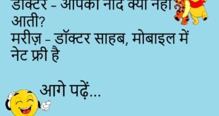 पत्नी – सुनिए जी, मैंने सपना देखा कि आप मुझे सोने की चूड़ियाँ दिला रहे हैं। पति – ठीक है, आज रात सपना पूरा कर दूँगा, सपना ही तो है!😊😊😊😊😊 ********************************************** टीचर – बताओ, बिजली कहाँ से आती है? पप्पू – सर, पड़ोस से… जब बिल नहीं भरते तो वहीं से खींच लेते हैं।😊😊😊😊😊 ********************************************** डॉक्टर – आपको नींद क्यों …