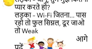 टीचर – ईमानदारी किसे कहते हैं? पप्पू – जब मम्मी पर्स में पैसे गिनती हैं और मैं बोलता हूँ कि दो रुपये गिरे थे, ये लो!😊😊😊😊😊 ********************************************** लड़की – जानू, तुम मुझे कितना प्यार करते हो? लड़का – Wi-Fi जितना… पास रहो तो फुल सिग्नल, दूर जाओ तो Weak!😊😊😊😊😊 ********************************************** पत्नी – मुझे अपने पापा के घर छोड़ आओ। पति …