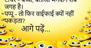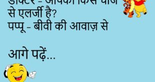 पत्नी – मैं तुम्हारी जिंदगी में कब आई थी? पति – जब मेरी मौज-मस्ती की लाइफ खत्म हुई थी।😊😊😊😊 ******************************** डॉक्टर – दवाई टाइम पर खा लेना। पप्पू – पर टाइम मिले कहाँ से? टाइम तो घड़ी खा जाती है।😊😊😊😊 ******************************** टीचर – बच्चो, बताओ भगवान सब जगह है। पप्पू – तो फिर वाईफाई क्यों नहीं पकड़ता?😊😊😊😊 ******************************** पत्नी – …