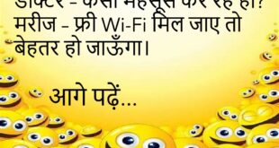 डॉक्टर – तुम्हें आराम की ज़रूरत है। मरीज – पर बीवी मानती कहाँ है?😊😊😊😊 ******************************** पप्पू – शादी का सबसे मजेदार हिस्सा क्या होता है? गप्पू – खाना।😊😊😊😊 ******************************** पत्नी – मैंने तुम्हारे लिए क्या नहीं किया? पति – शांति।😊😊😊😊 ******************************** दोस्त – आजकल सोशल मीडिया पर एक्टिव क्यों नहीं हो? पप्पू – क्योंकि नेट पैक खत्म हो गया है।😊😊😊😊 …