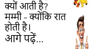 बच्चा – मम्मी, नींद क्यों आती है? मम्मी – क्योंकि रात होती है।😊😊😊😊 ******************************** डॉक्टर – तुम्हें नींद क्यों नहीं आती? पप्पू – क्योंकि इंटरनेट सस्ता है।😊😊😊😊 ******************************** पत्नी – मैं मोटी लग रही हूँ? पति – लग तो रही हो, पर सच बोलूँ तो खतरनाक लग रही हो।😊😊😊😊 ******************************** पप्पू – यार, पेट्रोल बहुत महंगा हो गया। गप्पू – …