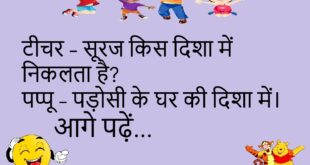 टीचर – बच्चो, मेहनत का फल मीठा होता है।पप्पू – लेकिन मैम, अगर मेहनत का फल मीठा होता है तो सब गन्ने का जूस क्यों बेचते हैं?😊😊😊😊 ********************************************* पत्नी – सुनो जी, मेरी आँखों में क्या देख रहे हो?पति – डॉक्टर का बिल… क्योंकि तुम्हें जरूर चश्मे की जरूरत है!😊😊😊😊 ********************************************* दोस्त – शादी कैसी रही?पप्पू – भाई, शादी नहीं… …