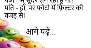 पत्नी – मुझे हीरे की अंगूठी चाहिए।पति – बिजली का बिल भर दो, घर हीरा बन जाएगा।😊😊😊😊 ******************************** डॉक्टर – क्या समस्या है?पप्पू – बीवी हर वक़्त डांटती है।डॉक्टर – ये बीमारी नहीं, किस्मत है।😊😊😊😊 ******************************** टीचर – बताओ “ATM” का मतलब क्या है?पप्पू – “At The Moment” पैसे नहीं हैं।😊😊😊😊 ******************************** पत्नी – मैं सुंदर लग रही हूँ ना?पति …