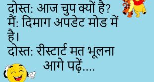 दोस्त – तुम्हें हॉबी क्या है?दोस्त – सोना।दोस्त – हाहाहा, सोने में भी हॉबी होती है! 😴 ******************************************* बच्चा – मम्मी मुझे नया गेम चाहिए।मम्मी – पहले पढ़ाई कर लो।बच्चा – गेम में पढ़ाई भी करवा देती हो? 🎮 ******************************************* पप्पू – मम्मी, मुझे मिठाई चाहिए।मम्मी – पहले हाथ धो लो।पप्पू – हाथ धोकर ही तो खाऊँगा! 🍬 ******************************************* दोस्त …