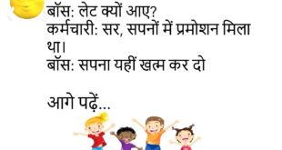 माँ: सुबह जल्दी क्यों नहीं उठते? मैं: माँ, सपनों में भी नींद पूरी नहीं होती। माँ: सपनों को भी छुट्टी दे दो 😅🛌 *********************************** पत्नी: सुनते क्यों नहीं हो? पति: सुन रहा हूँ। पत्नी: तो जवाब क्यों नहीं देते? पति: नेटवर्क स्लो है 📵😂 *********************************** बॉस: लेट क्यों आए? कर्मचारी: सर, सपनों में प्रमोशन मिला था। बॉस: सपना यहीं खत्म …