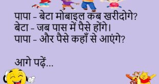 बच्चा – मम्मी, मुझे दूध दो।मम्मी – पहले नाश्ता खा लो।बच्चा – दूध में नाश्ता मिल जाता है? 🥛 ******************************************* पप्पू – मम्मी, मुझे नया फोन चाहिए।मम्मी – पुराने फोन में क्या कमी है?पप्पू – क्योंकि उसमें गेम नहीं चलते। 📱 ******************************************* टीचर – बताओ सूरज क्यों चमकता है?बच्चा – क्योंकि उसके पास बिजली है।टीचर – और बिजली कहाँ से …
