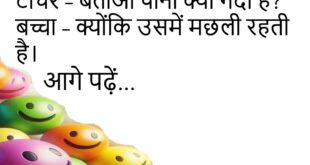 बच्चा – मम्मी मुझे दूध दो।मम्मी – पहले नाश्ता खा लो।बच्चा – दूध में नाश्ता भी मिल जाता है? 🥛 ******************************************* पप्पू – मम्मी, मुझे नया फोन चाहिए।मम्मी – पुराने फोन में क्या कमी है?पप्पू – गेम नहीं चलते। 📱 ******************************************* टीचर – बताओ पानी क्यों गंदा है?बच्चा – क्योंकि उसमें मछली रहती है। 🐟 ******************************************* दोस्त – तुम रोज़ …