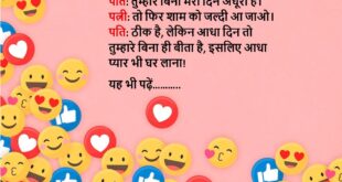 पत्नी: तुम मुझसे कितना प्यार करते हो? पति: जितना आसमान में तारे! पत्नी: वाह! बहुत खूब! पति (मुस्कुराते हुए): लेकिन वो तो गिनना बहुत मुश्किल है, इसलिए मैं तुम्हें रोज़ ही थोड़ा-थोड़ा प्यार करता हूँ!😆🤣🤣🤣🤣😝😝😝 ************************************************************************************ पति (गुस्से में): तुम हमेशा मेरी बातें नहीं सुनती! पत्नी (शांत होकर): सुनती हूँ, लेकिन कभी-कभी तो तुम इतने लंबे भाषण देते हो कि …