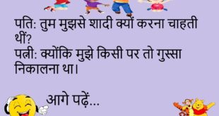 पति: शादी के बाद जिंदगी में क्या बदला? दोस्त: पहले माँ डांटती थी, अब बीवी।😊😊😊😊😊 ******************************************* बीवी – तुम मेरे लिए क्या कर सकते हो? पति – मोबाइल साइलेंट पर कर सकता हूँ।😊😊😊😊😊 ******************************************* बीवी – क्या मैं मोटी लग रही हूँ? पति – नहीं तो, बहुत हवा लग रही हो।😊😊😊😊😊 ******************************************* पति – तुमसे शादी करके बहुत सुकून मिला। …