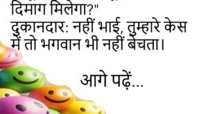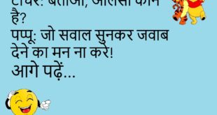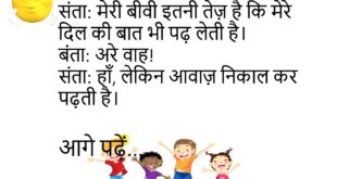 संता: मेरी बीवी मुझसे बहुत प्यार करती है।बंता: कैसे?संता: वो मेरे बिना शॉपिंग पे जाती ही नहीं।😊😊😊😊😊 ******************************************* पति: क्या तुम मुझसे प्यार करती हो?पत्नी: हाँ, लेकिन नेट पैक जितना – खत्म होने तक।😊😊😊😊😊 ******************************************* पप्पू: दादी, आपकी उम्र क्या है?दादी: बेटा, भगवान जाने।पप्पू: मतलब पासवर्ड भूल गईं आप भी!😊😊😊😊😊 ******************************************* संता: भाई, शादी क्यों करनी चाहिए?बंता: ताकि कोई तुम्हारा …