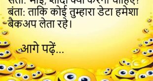 पत्नी: तुम मुझे कहां घुमाओगे?पति: ATM – ताकि तुम समझ सको असली हालात।😊😊😊😊😊 ******************************************* दोस्त: यार, तुम्हारी बीवी बहुत गुस्से वाली है।पति: हाँ, तभी तो गूगल भी पूछता है – “Are you sure?”😊😊😊😊😊 ******************************************* पप्पू: मम्मी, मुझे भी शादी करनी है।मम्मी: क्यों?पप्पू: ताकि कोई मेरा भी होमवर्क कर दे।😊😊😊😊😊 ******************************************* संता: भाई, मोबाइल बार-बार हैंग हो रहा है।बंता: शादीशुदा है …