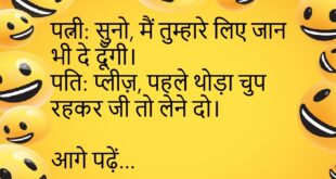 पत्नी: तुम मुझसे कितना प्यार करते हो?पति: जितना फोन की बैटरी बची होती है – 1% से 100% तक टेंशन में!😊😊😊😊😊 ******************************************* टीचर: नींद क्यों आ रही है क्लास में?पप्पू: सर, आप ही तो कहते हो सपनों को पूरा करो।😊😊😊😊😊 ******************************************* संता: डॉक्टर साहब, मेरा वजन कम नहीं हो रहा।डॉक्टर: तुम वॉक करते हो?संता: जी, रोज़ करता हूँ।डॉक्टर: कहाँ?संता: मोबाइल …