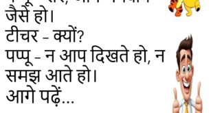 टीचर – पप्पू, बताओ देश का भविष्य कौन है? पप्पू – सर, व्हाट्सऐप यूनिवर्सिटी! 😂 ************************************************* डॉक्टर – दवा खा ली? मरीज – जी, खा ली… पर स्वाद अच्छा नहीं था! 😜 ************************************************* पत्नी – तुम्हें मेरी याद आती है? पति – हाँ, जब गैस सिलेंडर खाली होता है! 🤣 ************************************************* पप्पू – सर, आप भगवान जैसे हो। टीचर – …