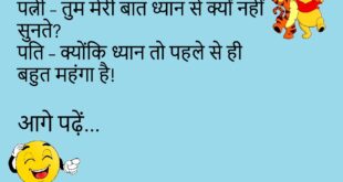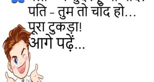 पत्नी – मुझे गोलगप्पे खिलाओ। पति – अभी नहीं। पत्नी – ठीक है, फिर मैं भी तुम्हें चाय नहीं दूंगी। पति – चलो बराबरी हो गई! 🤣 ************************************************* टीचर – ये बताओ, इंसान के शरीर में कितना पानी होता है? पप्पू – सर, शादी के बाद आँखों में सबसे ज़्यादा! 😂 ************************************************* पत्नी – तुम मुझे डांटते क्यों हो? पति …