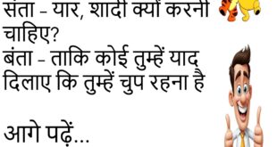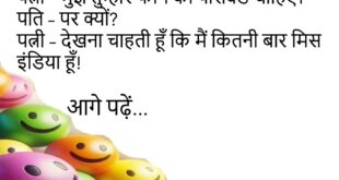 बंता – बीवी का सबसे अच्छा डायलॉग कौन सा है? संता – “तुम मुझे प्यार करते हो या मोबाइल को?” 😂 ************************************************* पत्नी – तुम मुझे कहाँ घुमाने ले जाओगे? पति – सपना नगरी में! 🤪 ************************************************* डॉक्टर – तुम इतने दुबले क्यों हो गए? मरीज – बीवी ने डाइट कंट्रोल करवा दिया… खुद खा जाती है! 😂 ************************************************* पप्पू …