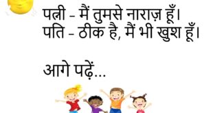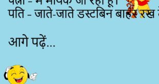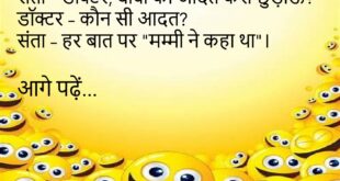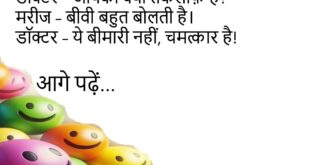बच्चा – पापा, आप मुझे किसलिए प्यार करते हो? पापा – क्योंकि तेरी मम्मी ने कहा है।😊😊😊😊 ********************************************* पप्पू – मेरी बीवी तो मुझे राजा मानती है। दोस्त – कैसे? पप्पू – हर बात पर कहती है, “आपका राज चलता है।”😊😊😊😊 ********************************************* डॉक्टर – आपको किस चीज से डर लगता है? मरीज – बीवी से।😊😊😊😊 ********************************************* पत्नी – मैं मायके …