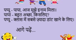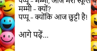 पप्पू – मम्मी, किताब कहाँ है? मम्मी – जो पढ़ाई की किताब है, वहीं रखी है। पप्पू – अरे, मैं तो कॉमिक्स ढूँढ रहा था।😊😊😊😊 ************************************* टीचर – कौन सा पक्षी सबसे ईमानदार है? पप्पू – हंस सर, क्योंकि वो हंसते हुए सच बोल देता है।😊😊😊😊 ************************************* पति – सुनो, मेरी शर्ट प्रेस कर दो। पत्नी – खुद क्यों नहीं …