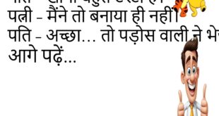 टीचर – बताओ, लापरवाह किसे कहते हैं?पप्पू – जो बीवी की बात ध्यान से ना सुने।😊😊😊😊 ************************************* पति – खाना बहुत टेस्टी है।पत्नी – मैंने तो बनाया ही नहीं।पति – अच्छा… तो पड़ोस वाली ने भेजा होगा!😊😊😊😊 ************************************* बच्चा – मम्मी, जब मैं पैदा हुआ तो आप कहाँ थीं?मम्मी – मैं हॉस्पिटल में थी।बच्चा – और पापा?मम्मी – वो बहुत …