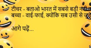 पत्नी – तुम मुझे कितना प्यार करते हो? पति – जितना मोबाइल को करता हूँ। पत्नी – ओह, मतलब 24 घंटे! पति – नहीं, जब तक चार्ज रहता है।😊😊😊😊 ************************************* बच्चा – मम्मी, मैं बड़ा होकर क्या बनूँगा? मम्मी – रिजल्ट देख कर ही पता चलेगा।😊😊😊😊 ************************************* टीचर – बताओ भारत में सबसे बड़ी नदी कौन सी है? बच्चा – …