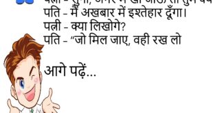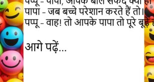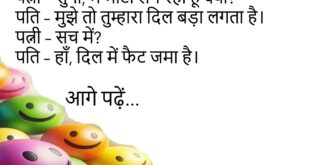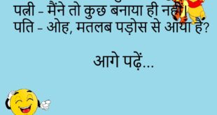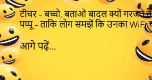 पत्नी – सुनो जी, मैं कैसी लग रही हूँ? पति – सच बताऊँ या तुम्हारा मूड अच्छा रखना है?😊😊😊😊 *********************************************** टीचर – बताओ, दुनिया का सबसे पुराना तेल कौन सा है? पप्पू – कुतुब-मिनार का तेल… सब कहते हैं कुतुबमिनार का तेल बेचो!😊😊😊😊 *********************************************** डॉक्टर – आपको कब से खांसी है? मरीज – जब से मोहल्ले वालों ने वाई-फाई पासवर्ड …