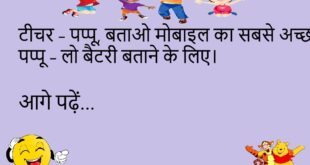 टीचर – बताओ, पढ़ाई क्यों जरूरी है?बच्चा – ताकि मोबाइल की बैटरी खत्म होने पर भी टाइमपास कर सकें।😊😊😊😊 *********************************************** पति – सुनो, तुम मुझसे प्यार करती हो या मेरे पैसों से?पत्नी – दोनों से।पति – कैसे?पत्नी – पैसा मेरा और प्यार तुम्हारा।😊😊😊😊 *********************************************** डॉक्टर – आपको क्या तकलीफ़ है?मरीज – नींद बहुत आती है।डॉक्टर – तो दवा चाहिए या …