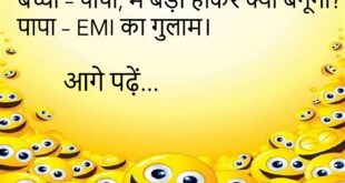 दोस्त – भाई, बीवी से डरते क्यों हो?पति – डरना जरूरी है, वरना वो याद दिलाती रहती है।😊😊😊😊 *********************************************** बेटा – पापा, मुझे मोबाइल चाहिए।पापा – क्यों?बेटा – ताकि मैं भी वॉट्सऐप पर पढ़ाई का बहाना कर सकूँ।😊😊😊😊 *********************************************** टीचर – बताओ, पृथ्वी गोल क्यों है?बच्चा – ताकि घूम-फिरकर EMI फिर से हमारे पास आ जाए।😊😊😊😊 *********************************************** पत्नी – मुझे …
