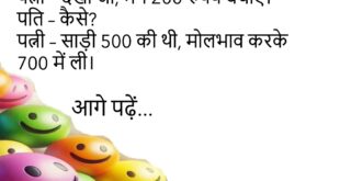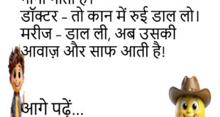 पत्नी – तुम्हें मेरी किस बात से सबसे ज़्यादा प्यार है? पति – तेरी वो बात, जो तू कभी करती ही नहीं… चुप रहने वाली!😊😊😊😊 *********************************************** शिक्षक – पढ़ाई क्यों नहीं करते? पप्पू – सर, पढ़ाई तो करता हूँ… लेकिन किताबें सहयोग नहीं करतीं!😊😊😊😊 *********************************************** डॉक्टर – नींद क्यों नहीं आती? मरीज – डॉक्टर साहब, पड़ोसी गाना गाता है। डॉक्टर …