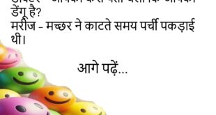 पत्नी – सुनो जी, मैं मोटी तो नहीं लगती?पति – नहीं… तुम तो हवा से हल्की लगती हो, बस… हवा ज़्यादा चाहिए!😊😊😊😊 डॉक्टर – आपको कैसे पता चला कि आपको डेंगू है?मरीज – मच्छर ने काटते समय पर्ची पकड़ाई थी।😊😊😊😊 *********************************************** पप्पू – सर, कॉपी साफ़ क्यों लिखें?टीचर – ताकि मैं भी अंदाज़ा न लगा पाऊँ कि तुमने क्या लिखा …