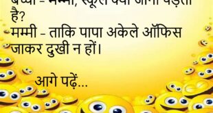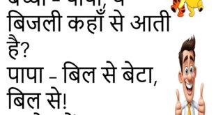 पत्नी – सुनो जी, मुझे चाँद पर ले चलो। पति – पहले राशन-पानी का हिसाब दो, फिर स्पेस शटल बुक करता हूँ।😊😊😊😊 *********************************************** बच्चा – पापा, ये बिजली कहाँ से आती है? पापा – बिल से बेटा, बिल से!😊😊😊😊 *********************************************** टीचर – “बीमारी” और “लाचारी” में क्या फ़र्क है? पप्पू – बीमारी को दवाई ठीक कर देती है, लेकिन लाचारी …