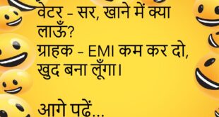 पत्नी – मैं तुम्हारे बिना नहीं जी सकती।पति – तो फिर वाई-फाई बंद कर देता हूँ।😊😊😊😊 *********************************************** वेटर – सर, खाने में क्या लाऊँ?ग्राहक – EMI कम कर दो, खुद बना लूँगा।😊😊😊😊 *********************************************** टीचर – शेर और बकरी में क्या फर्क है?पप्पू – शेर व्हाट्सऐप पर ‘Seen’ कर देता है, बकरी रिप्लाई भी कर देती है।😊😊😊😊 *********************************************** पत्नी – मुझे …