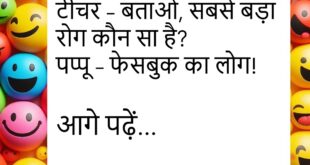 टीचर – बताओ, सबसे बड़ा रोग कौन सा है? पप्पू – फेसबुक का लोग!😊😊😊😊 *********************************************** दोस्त – यार, आजकल बीवी से बहुत डरता हूँ। दूसरा – क्यों? पहला – क्योंकि वो कहती है कि Google से ज़्यादा सब जानती हूँ। *********************************************** पति – मेरी बीवी बहुत स्वीट है। दोस्त – तो शुगर लेवल चेक करवाया कि नहीं?😊😊😊😊 *********************************************** बच्चा – …