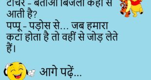 डॉक्टर – नींद क्यों नहीं आती? मरीज – डॉक्टर साहब, Wi-Fi का पासवर्ड सोचते-सोचते सुबह हो जाती है। ***************************************** टीचर – बताओ बिजली कहाँ से आती है? पप्पू – पड़ोस से… जब हमारा कटा होता है तो वहीं से जोड़ लेते हैं।😊😊😊😊 ***************************************** पत्नी – सुनिए, मैं मोटी तो नहीं लग रही? पति – नहीं, बस वज़न थोड़ा फुल HD …
