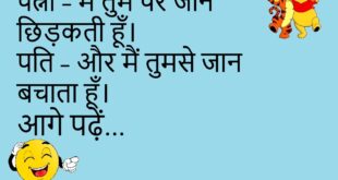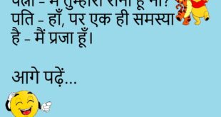 पत्नी – मैं तुम्हारी रानी हूँ ना? पति – हाँ, पर एक ही समस्या है – मैं प्रजा हूँ।😊😊😊😊 ***************************************** दोस्त – शादी कैसी रही? दूसरा – भाई, बारात तो गई थी… पर बारूद फट गया।😊😊😊😊 ***************************************** गर्लफ्रेंड – तुम गुस्सा क्यों हो? बॉयफ्रेंड – तुम्हें कॉल किया, तुम्हारे पापा ने उठाया। गर्ल – तो? बॉयफ्रेंड – उन्होंने कहा, “बेटा, …