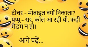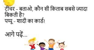 बच्चा – मम्मी, पड़ोसी अंकल को पुलिस क्यों ले गई? मम्मी – बेटा, वो वाई-फाई हैक करते थे।😊😊😊😊 *********************************************** पप्पू – मेरी बीवी बहुत समझदार है। गप्पू – तो फिर परेशान क्यों हो? पप्पू – इसी लिए तो परेशान हूँ।😊😊😊😊 *********************************************** टीचर – बताओ, कौन सी किताब सबसे ज्यादा बिकती है? पप्पू – शादी का कार्ड!😊😊😊😊 *********************************************** वेटर – सर, …