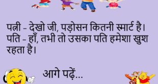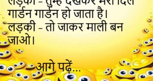 लड़का – तुम्हें देखकर मेरा दिल गार्डन गार्डन हो जाता है। लड़की – तो जाकर माली बन जाओ।😊😊😊😊 ***************************************** पत्नी – तुम मुझे कभी बाहर क्यों नहीं घुमाते? पति – तुम्हें घर में घुमाकर थक जाता हूँ।😊😊😊😊 ***************************************** बॉय – तुम बहुत स्वीट हो। गर्ल – तो फिर मुझे शुगर क्यों नहीं हो गई?😊😊😊😊 ***************************************** पत्नी – खाना खाया? पति …