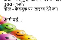 गर्ल – तुम मुझे चॉकलेट क्यों नहीं देते? बॉय – क्योंकि तुम्हें मिठास से डायबिटीज हो जाएगी।😊😊😊😊 ***************************************** पत्नी – खाना बना दूँ? पति – हाँ, लेकिन इस बार गैस पर ही बनाना, पिछली बार वाई-फाई पर बना रही थी क्या?😊😊😊😊 ***************************************** दोस्त – यार, तुम्हें पता है जॉब मिल गई। दूसरा – कहाँ? दोस्त – फेसबुक पर, लाइक्स देने …