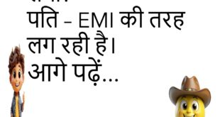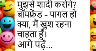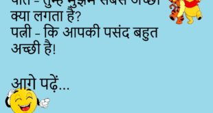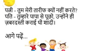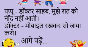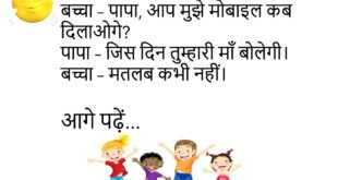 पत्नी – मैं मायके जा रही हूँ। पति – रास्ता भूल मत जाना।😊😊😊😊 *************************************** दोस्त – यार, बीवी से इतना डरते क्यों हो? पप्पू – क्योंकि डर ही सच्चा प्यार है।😊😊😊😊 *************************************** बच्चा – पापा, आप मुझे मोबाइल कब दिलाओगे? पापा – जिस दिन तुम्हारी माँ बोलेगी। बच्चा – मतलब कभी नहीं।😊😊😊😊 *************************************** पत्नी – मुझसे कितना प्यार करते हो? …