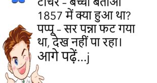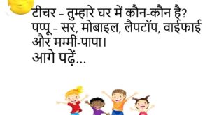 टीचर – तुम्हारे घर में कौन-कौन है? पप्पू – सर, मोबाइल, लैपटॉप, वाईफाई और मम्मी-पापा।😊😊😊😊😊 ****************************************** पत्नी – सुनो जी, मैं कैसी लग रही हूँ? पति – कसम से, तुम्हें देखकर तो समय भी रुक जाता है। पत्नी – ओह्ह… इतना प्यार? पति – नहीं, घड़ी देखकर बोला था… “रुक जा ओ लड़की, अभी वक्त नहीं हुआ है।”😊😊😊😊😊 ****************************************** पप्पू …