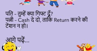 पति – तुम्हें क्या गिफ्ट दूँ? पत्नी – Cash दे दो, ताकि Return करने की टेंशन न हो।😊😊😊😊😊 ********************************************** गर्लफ्रेंड – तुम मुझे भूल तो नहीं जाओगे? बॉयफ्रेंड – पागल हो क्या? मोबाइल में Password ही तुम्हारे नाम का है।😊😊😊😊😊 पप्पू – मम्मी, भूख लगी है। मम्मी – तो Kitchen में देखो। पप्पू – Kitchen में तो गैस भी भूखी …