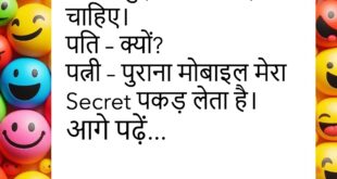 पति – मैं तुम्हें छोड़कर चला जाऊँगा। पत्नी – तो मैं भी तुम्हें लेने चली आऊँगी।😊😊😊😊😊 ********************************************** टीचर – Honest का मतलब बताओ। पप्पू – Honest मतलब, जब Result में Zero आये और हम कहें – हाँ यही मेरा है।😊😊😊😊😊 ********************************************** पत्नी – मुझे Birthday पर क्या Gift दोगे? पति – जो तुम्हारे मन में हो वही दे दूँगा। पत्नी …