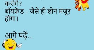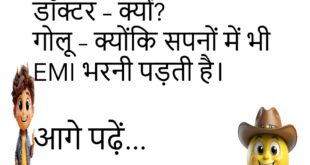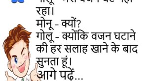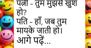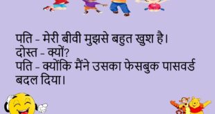 पत्नी – मैं तुमसे बहुत प्यार करती हूं।पति – मैं भी… जब तुम शॉपिंग पर नहीं होती।😊😊😊😊 ****************************************** डॉक्टर – तुम्हें आराम चाहिए।मरीज – बीवी को भी यही बोल दो, तभी आराम मिलेगा।😊😊😊😊 ****************************************** गोलू – आज खाना बहुत अच्छा है।पत्नी – सच में?गोलू – हां, होटल वाला खाना है न!😊😊😊😊 ****************************************** पति – मेरी बीवी मुझसे बहुत खुश है।दोस्त …