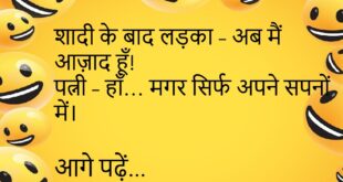 पत्नी – तुम्हारे बिना मैं अधूरी हूं।पति – और मेरे साथ पूरी तरह परेशान।😊😊😊😊 ****************************************** गोलू – यार, मैं अपनी बीवी को खुश कैसे करूं?मोनू – ATM कार्ड दो, पिन बताओ… बाकी काम वो खुद कर लेगी।😊😊😊😊 ****************************************** टीचर – ईमानदारी का इनाम क्या है?पप्पू – घर में शांति।😊😊😊😊 ****************************************** पत्नी – मैं जा रही हूं मायके।पति – अच्छा, कब …