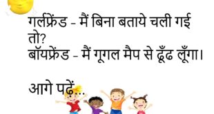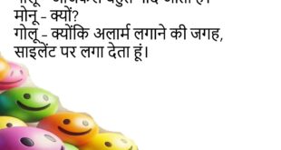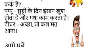 टीचर – कौन-सी गैस हमें हंसाती है?पप्पू – WhatsApp Status Gas।😊😊😊😊 ****************************************** पति – आज खाना बहुत स्वादिष्ट है।पत्नी – सच में?पति – हां, आज तुम्हें बनाने का मौका नहीं मिला न।😊😊😊😊 ****************************************** गोलू – मेरी गर्लफ्रेंड मुझे छोड़कर चली गई।मोनू – क्यों?गोलू – उसने कहा, “तुम मेरे सपनों के राजकुमार नहीं हो।”मोनू – तो?गोलू – मैंने भी कहा, “और …